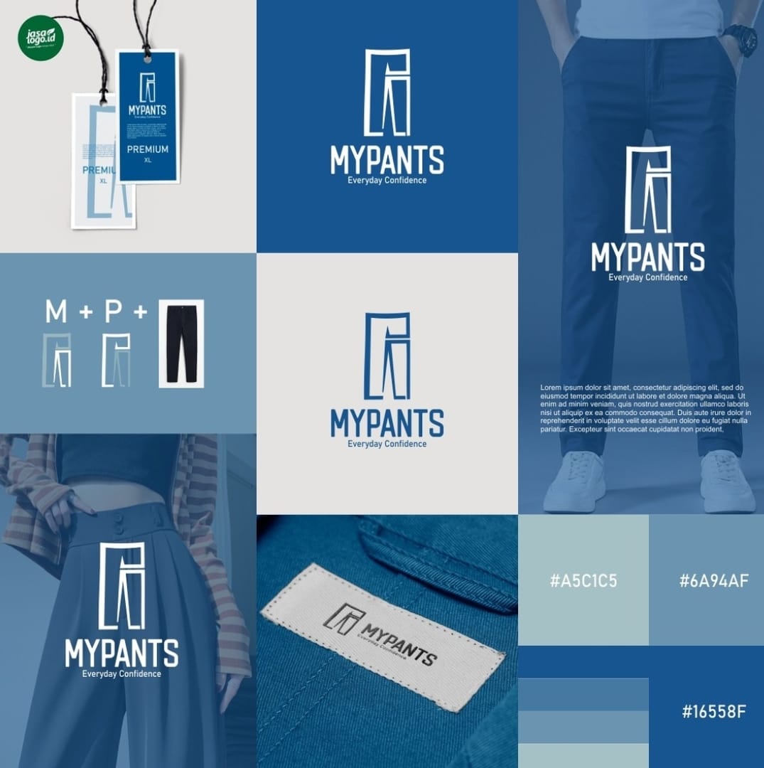 Logo tersebut menggunakan ikon logo berupa gambar celana yang hanya menggunakan garis line. Garis outline pada ikon tersebut menciptakan ruang negatif di tengah ikon yang membuat tampilan ikon lebih sederhana. Jika logo menggunakan ikon dengan penuh, maka tampilan desain akan kurang menarik.