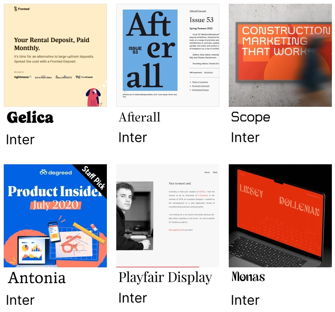 Dalam dunia desain grafis pada tahun 2024, penggunaan tipografi font modern yang sederhana dan elegan banyak digunakan, karena lebih fleksibel pada media digital. Kebanyakan desain UI/UX hingga desain print juga efektif untuk menciptakan kesan formal dan profesional. Berikut contoh penggunaan populer dari tipografi serif dan sans serif dalam desain: