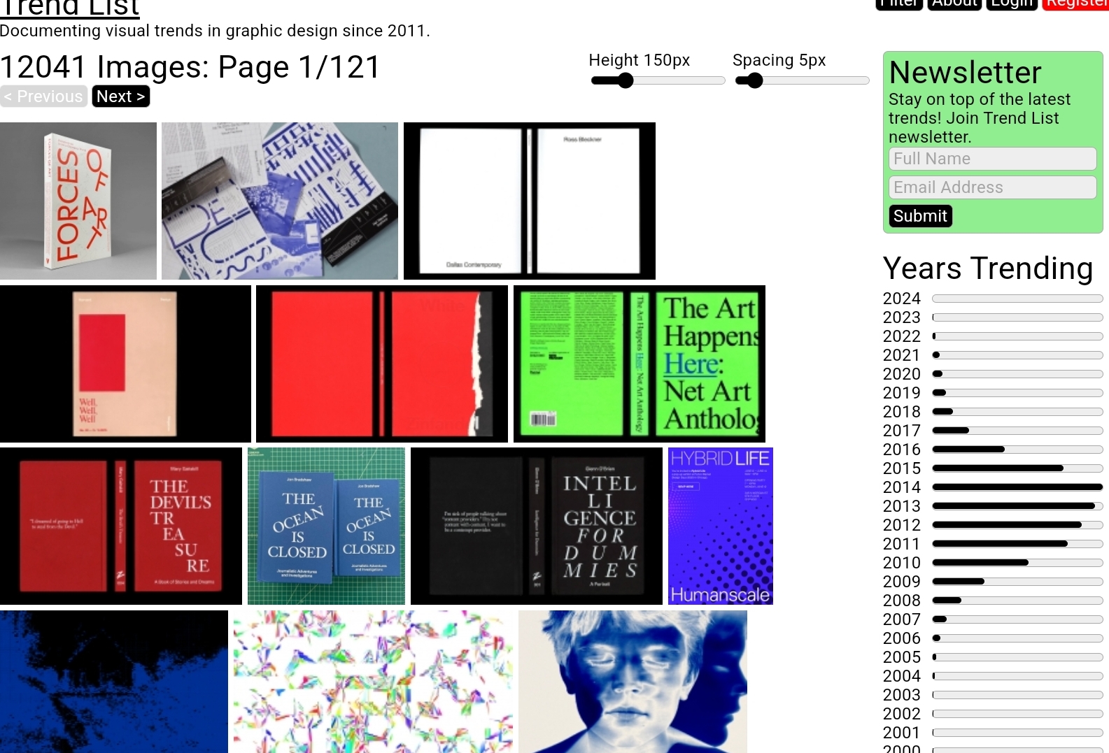 Berbeda dengan website lain yang berfokus menyediakan berbagai jenis desain grafis yang bermacam-macam. Dalam platform satu ini kamu bisa mencari inspirasi desain dari tahun ke tahun. Trend list membantu desainer untuk melihat tren desain dari waktu ke waktu, termasuk desain web, tipografi, dan branding. Menggunakan trend list ini akan membantu desainer untuk terus up to date dengan tren desain yang baru.