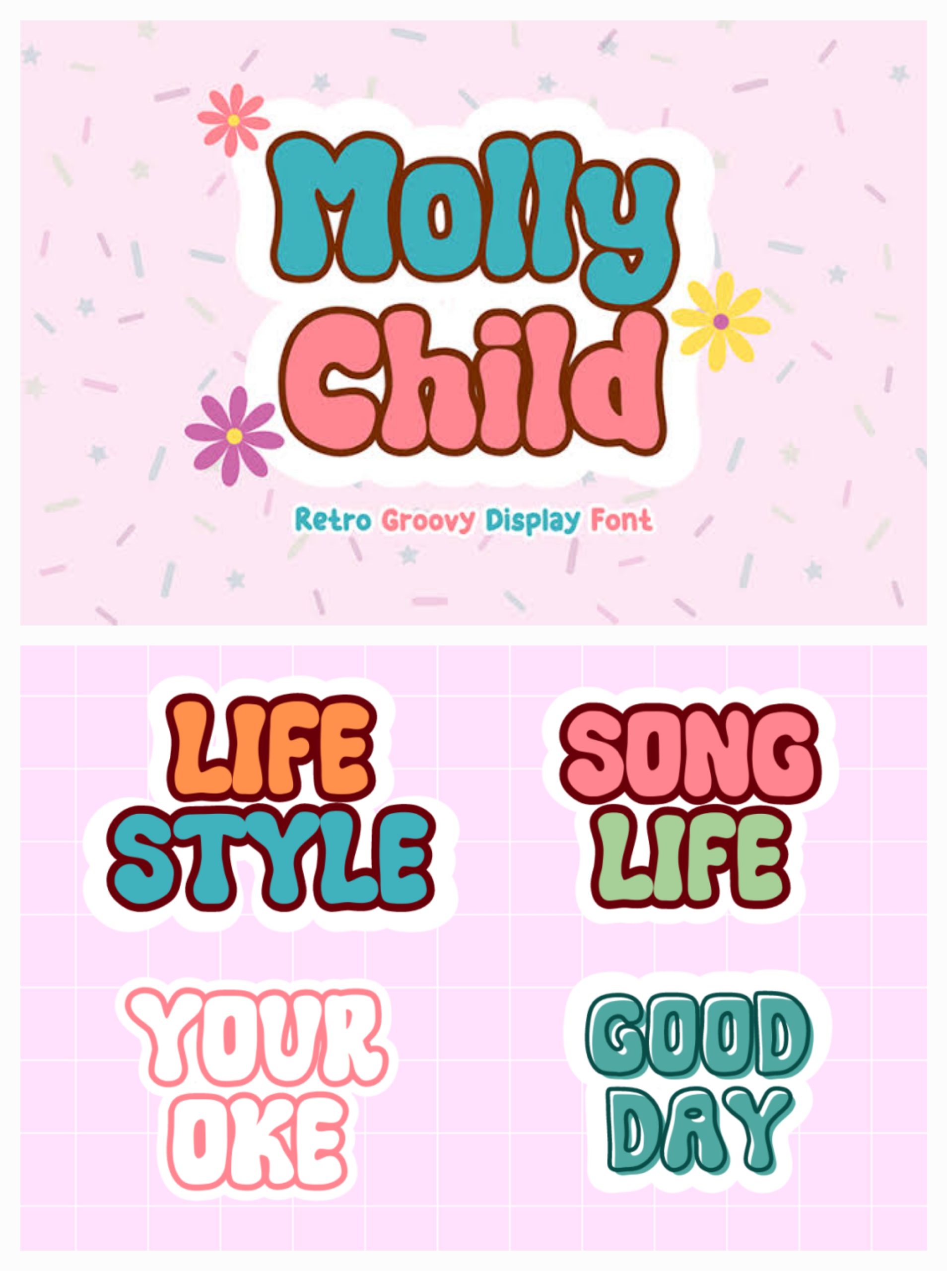 Font molly child memiliki tampilan huruf bersih meski memiliki font yang groovy, tidak mengurangi keterbacaan teks. Gaya font ini akan relevan dengan kombinasi warna cerah, gambar kartun dan efek holografik yang menarik. Tambahan outline yang tebal dengan warna berbeda akan membantu meningkatkan keterbacaan pada latar belakang y2k yang terkadang ramai.