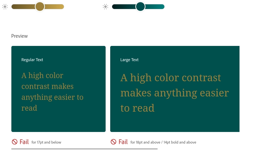 Sementara itu kan ada tulisan fail jika kecerahan warna yang dipilih kurang kontras sehingga keterbacaan kurang jelas. Ini akan membantu memudahkan desainer dalam mengatur kecerahan yang tepat. Ketika warna fail, maka pada bagian sebelah kanan terdapat rekomendasi kombinasi kecerahan warna yang memiliki keterbacaan yang jelas.